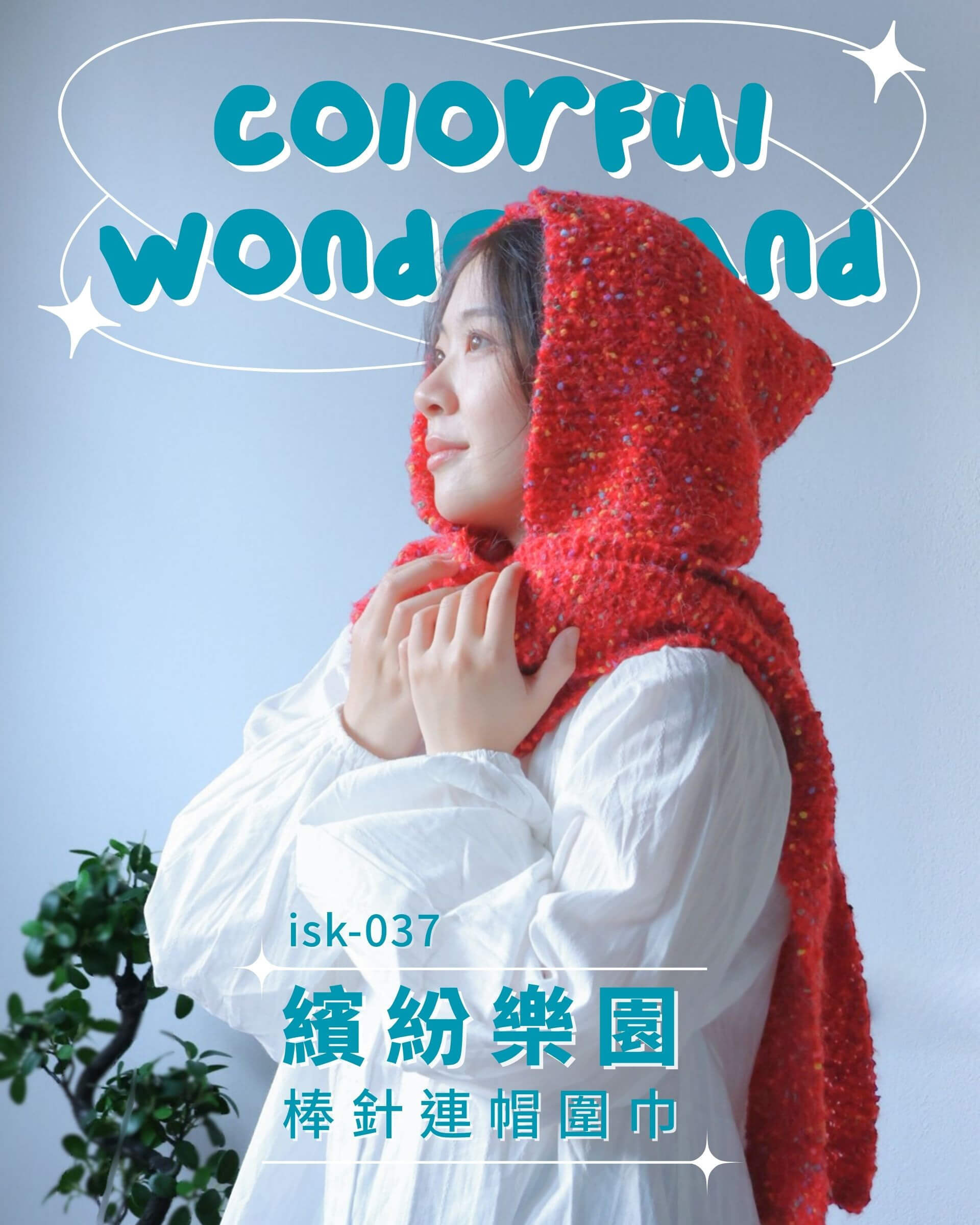 isk-037,繽紛樂園 |棒針連帽式圍巾,材料包+教學影片。早鳥售完為止!
