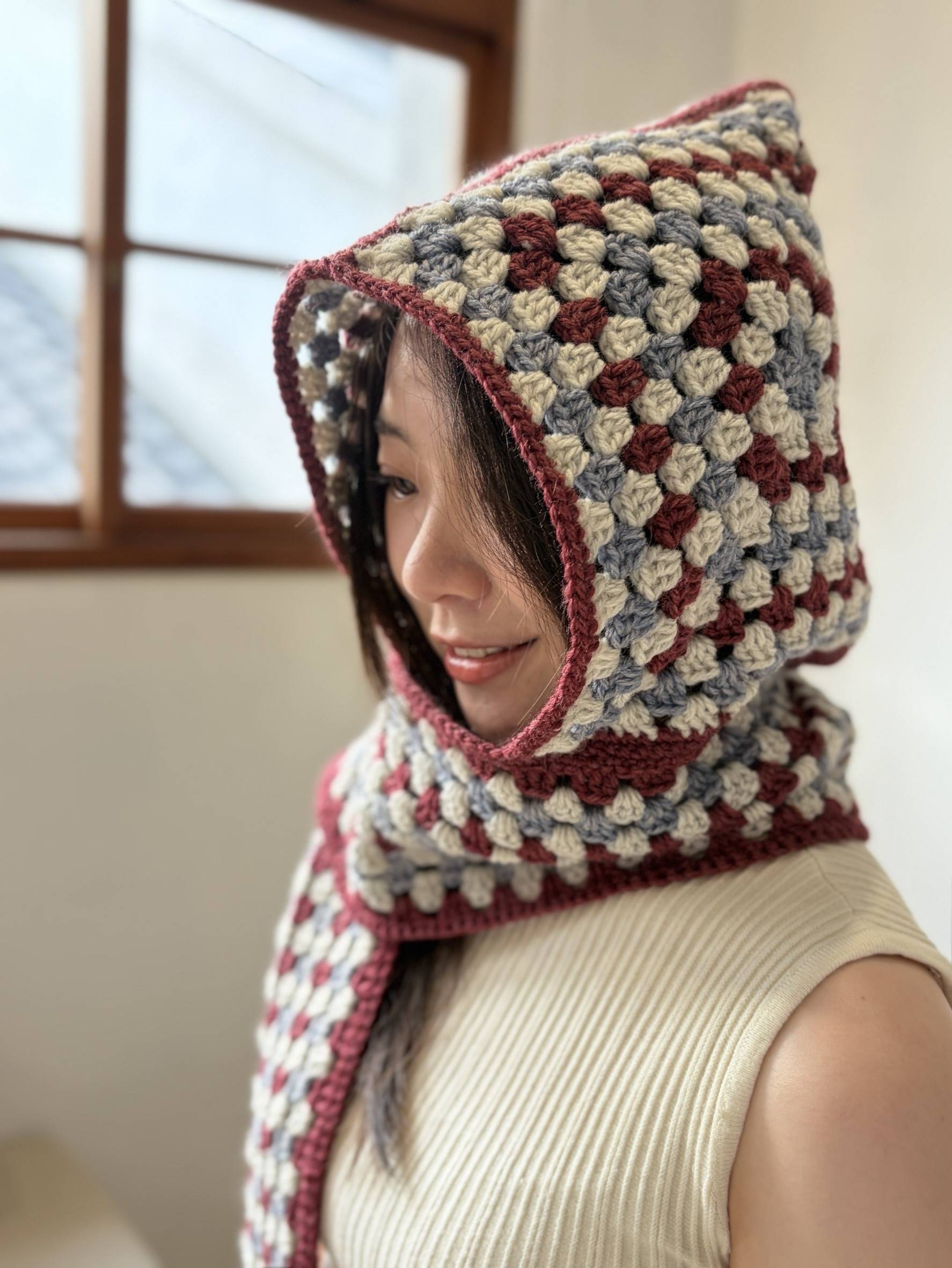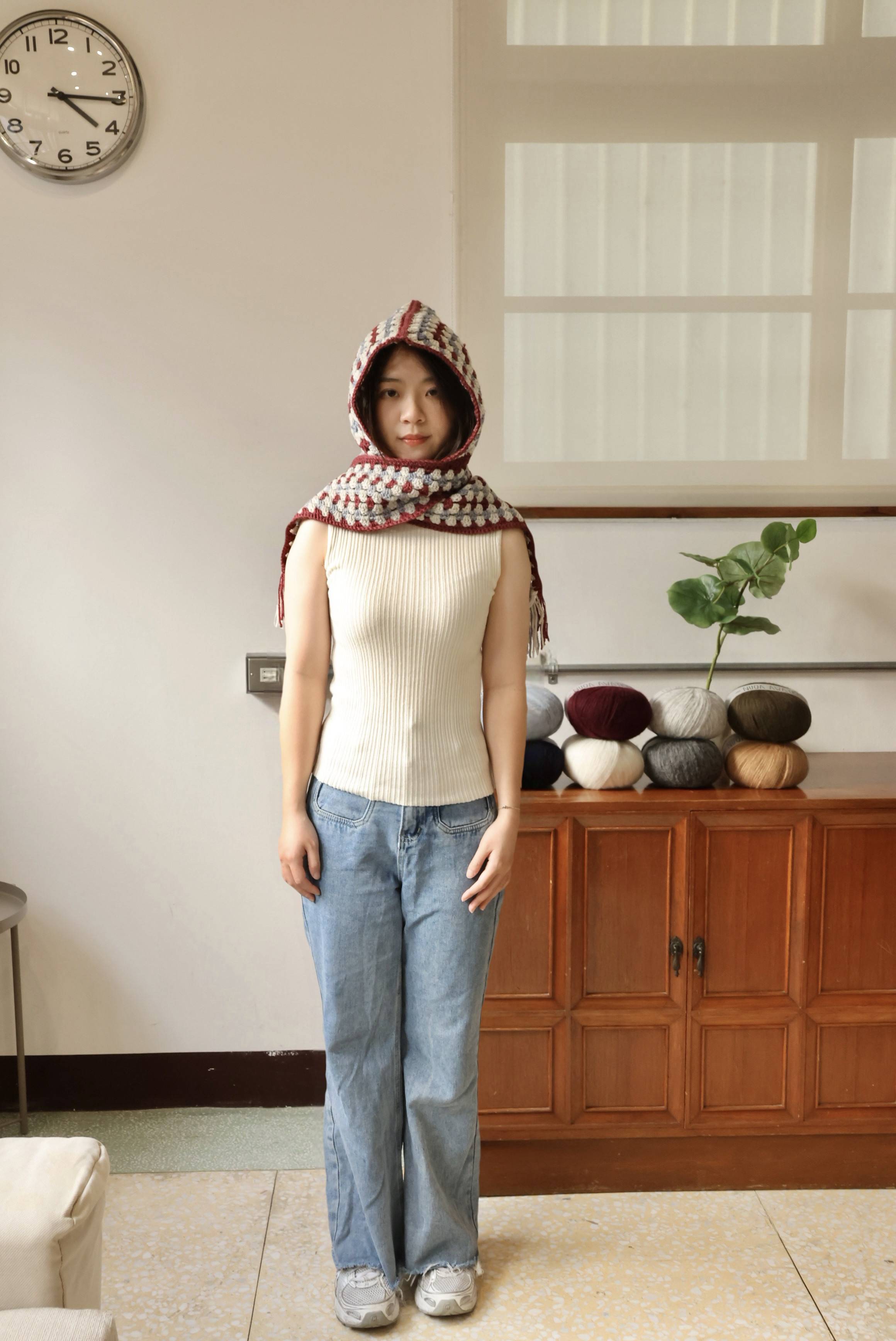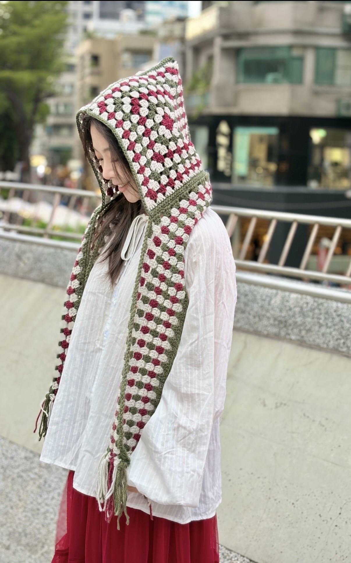 這款「有帽子的花樣圍巾」,結合帽子、圍巾、圍脖三種功能,從頭到頸,細膩守護。輕輕罩上帽沿,整個人都被柔軟包裹。不只保暖,也是一份安心的風格。