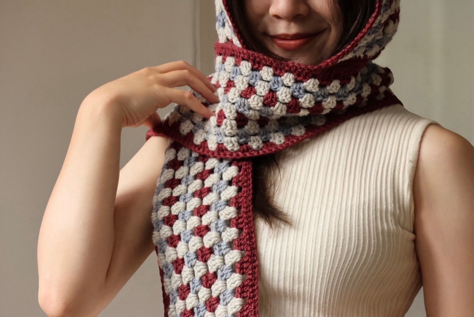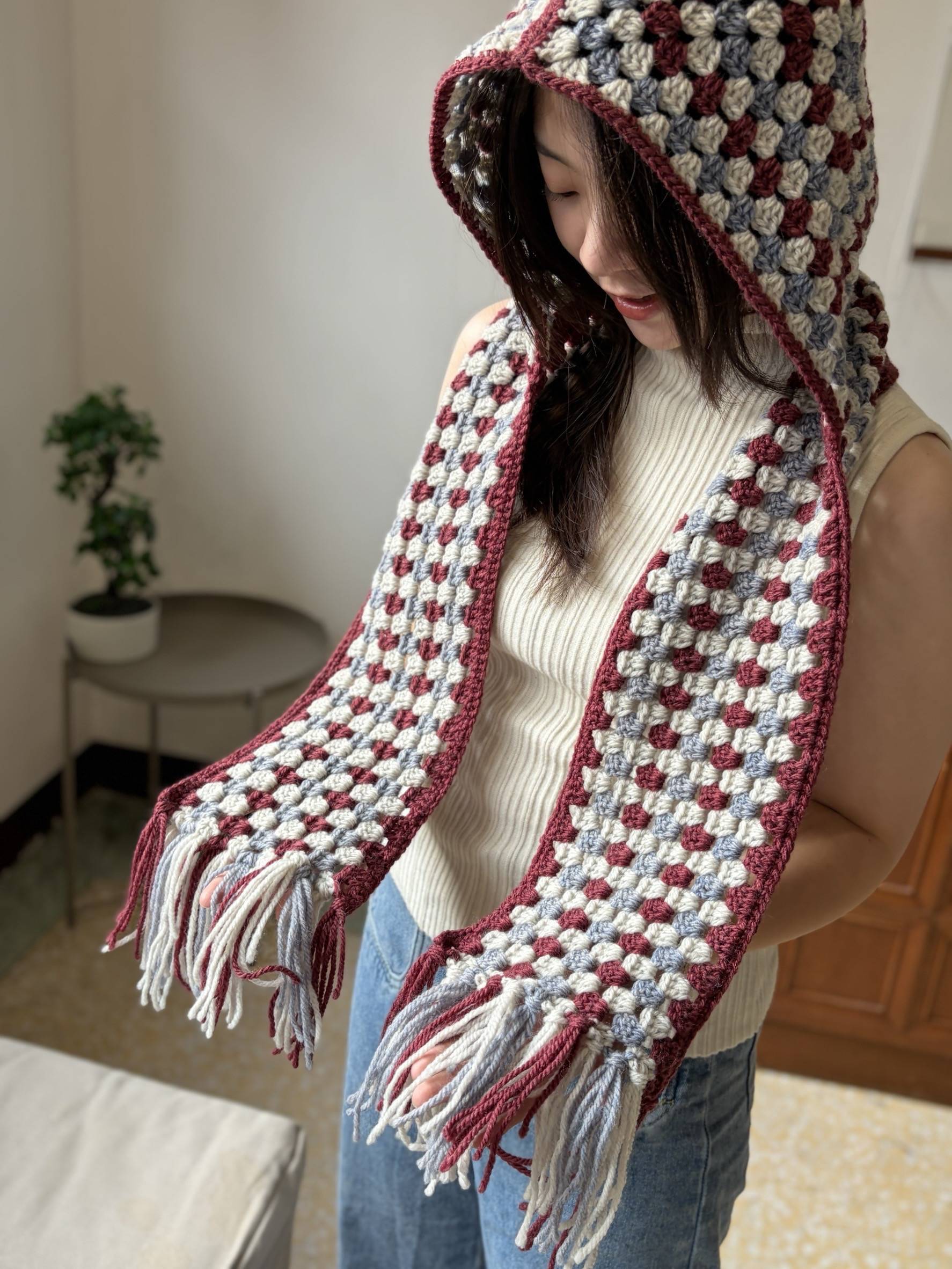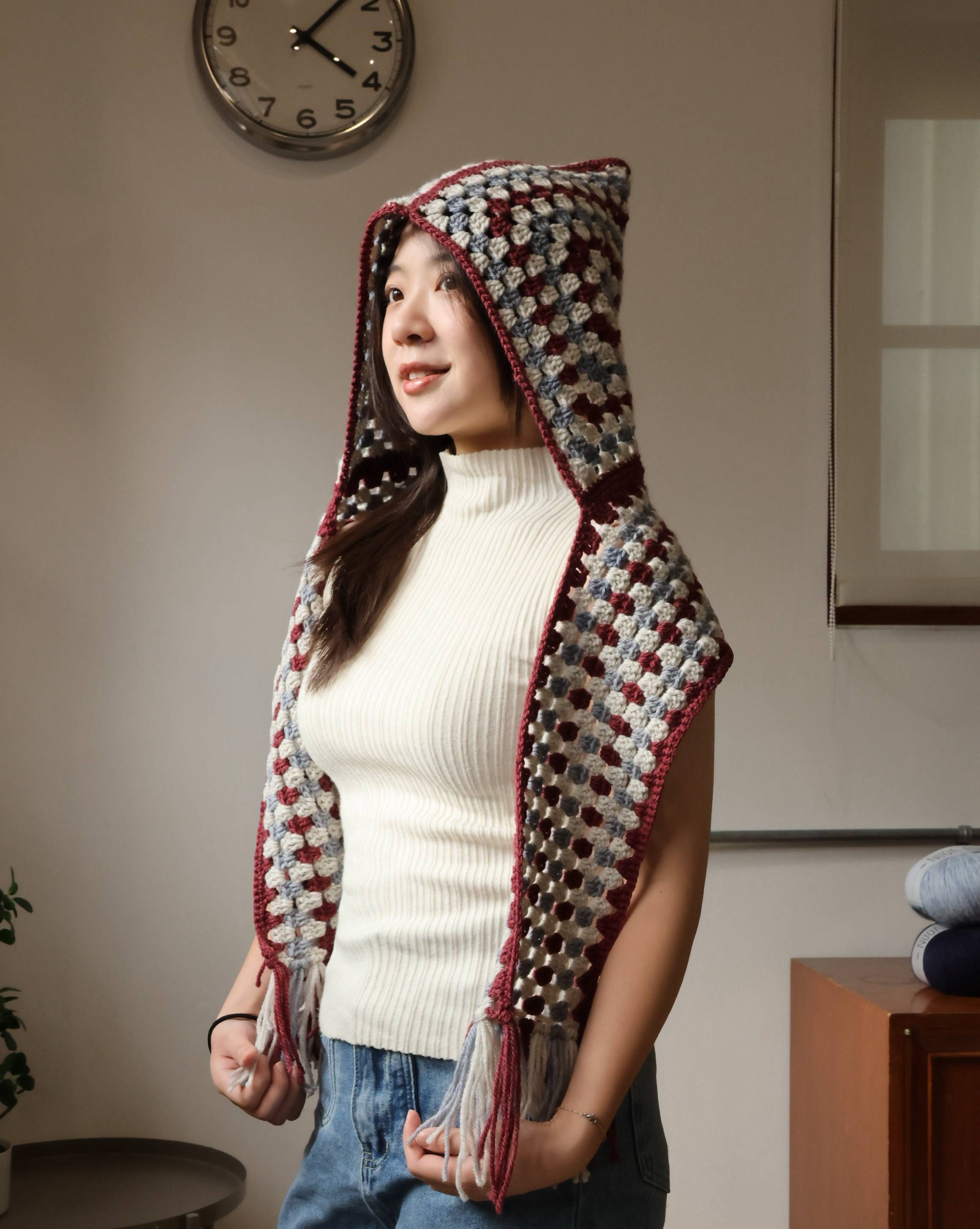 這款「有帽子的花樣圍巾」,結合帽子、圍巾、圍脖三種功能,從頭到頸,細膩守護。輕輕罩上帽沿,整個人都被柔軟包裹。不只保暖,也是一份安心的風格。