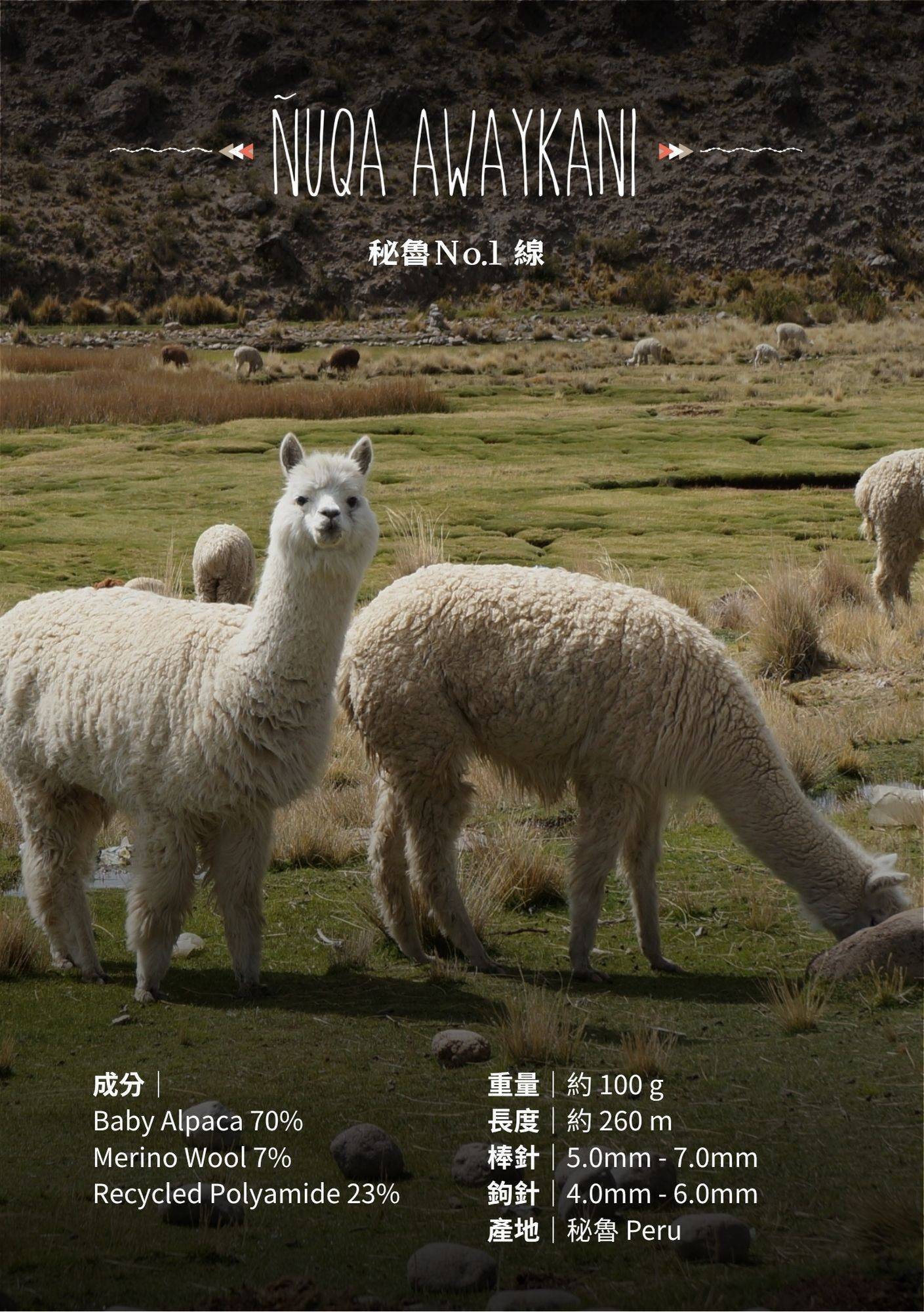 ÑUQA AWAYKANI – 秘魯 No.1高原羊駝毛線使用來自頂級羊駝細纖維(baby alpaca),結合柔軟彈性的美麗諾羊毛與環保概念的再生尼龍。精準的混紡比例,使線材兼具柔軟與堅韌,不僅賦予極佳的彈性與耐用性,更讓成品輕盈貼身,穿著時帶來舒適而溫潤的觸感。