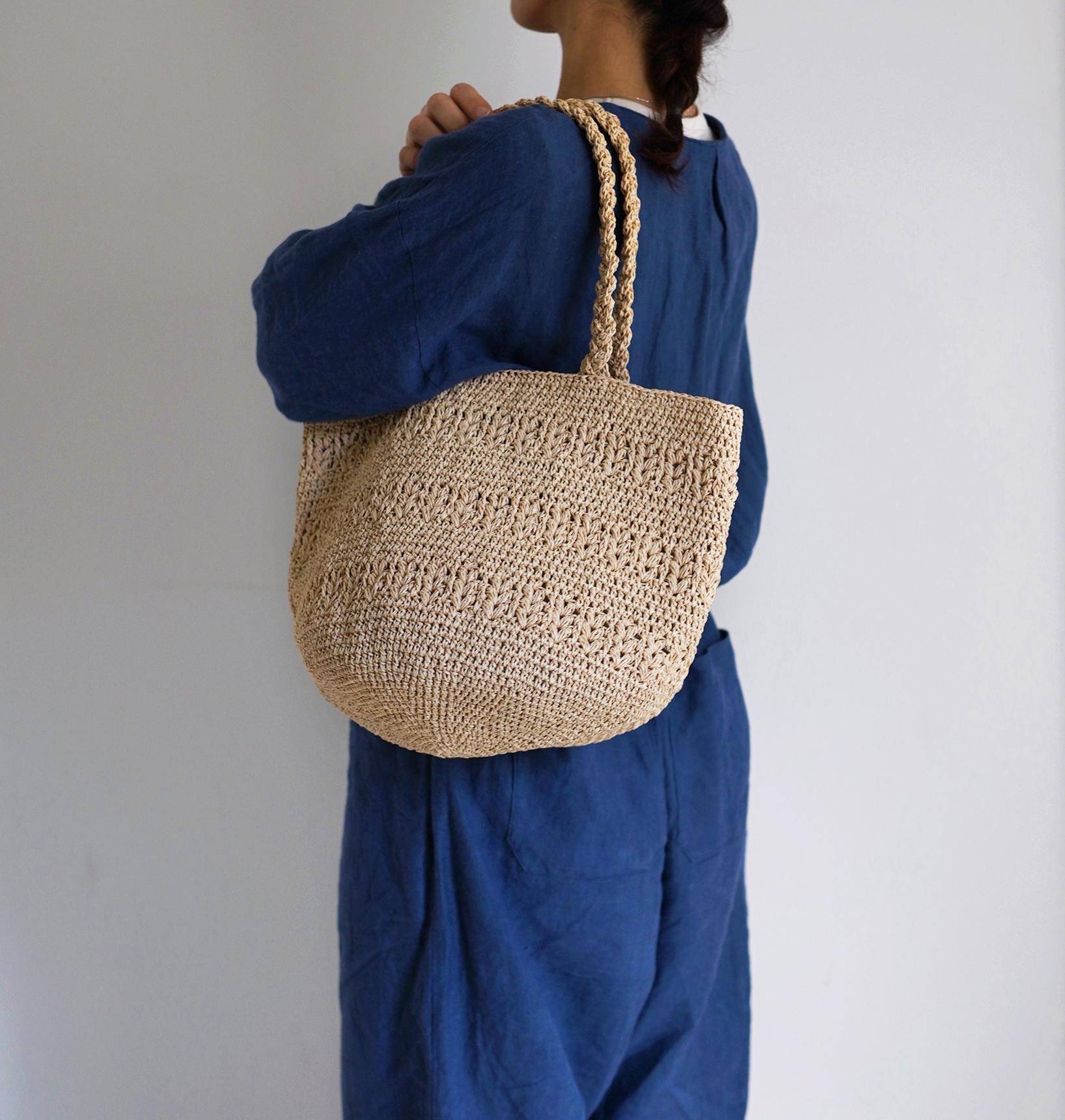 包包從底部中心開始,以畫圓的方式向外編織,形成容量充足的托特包造型。