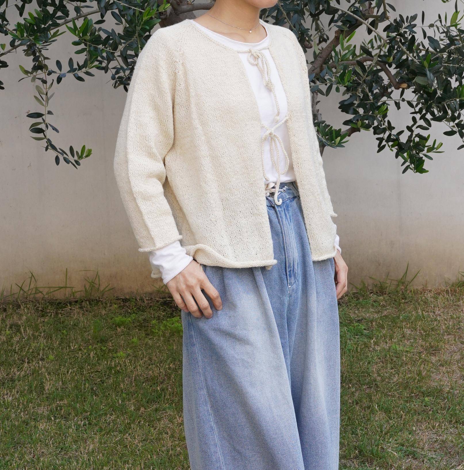 使用「亞麻羊毛羊駝(リネンウールアルパカ)」編織的七分袖綁帶針織外套。