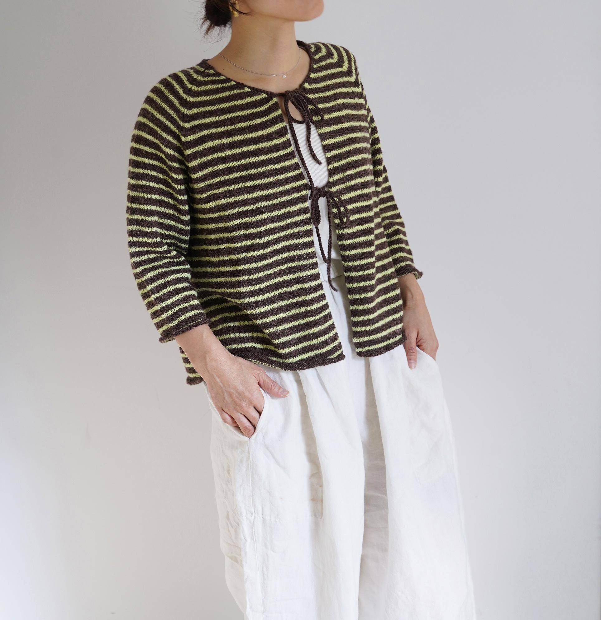 使用「亞麻羊毛羊駝(リネンウールアルパカ)」編織的七分袖綁帶針織外套。